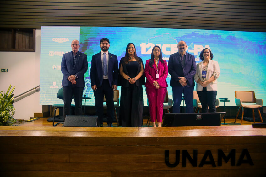 Na mesa de abertura estiveram presentes: A Presidente do CREA-PA, Engenheira Civil, Adriana Falconeri; vice-presidente do CREA-PA, Eng. de Controle e Automação, Everton Ruggeri; Diretora Financeira da Caixa de Assistência dos Profissionais do CREA-PA (Mútua-PA) Engenheira Ambiental, Thais Braga; Presidente da Federação das Indústrias do Estado do Pará (FIEPA), Alex Carvalho; Pró-Reitor de Pesquisa e Extensão e Coordenador do Comitê COP30 pela UNAMA, professor e Dr. João Claudio Tupinambá Arroyo e a Secretária Executiva de Obras e Infraestrutura de Belém (SEINFRA), Geofísica, Engenheira Civil, Danusa Mayara de Souza.