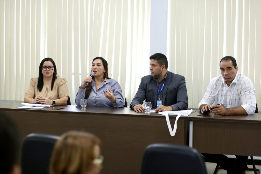 Na composição da mesa durante a reunião, estiveram presentes o Gerente de Relações Institucionais do Conselho, Eng. Civil Arthur Amaral, o Superintendente Kleber Santos, Diretora de gestão de desenvolvimento agrário e fundiário (DEAF), Mariceli Moura e do Especialista em Regularização Fundiária, Eng. Agrônomo Cleber Oliveira.