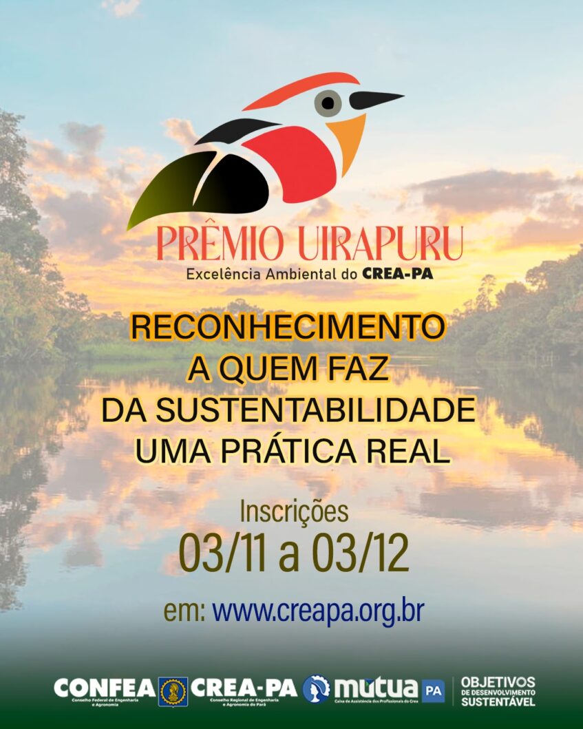 O Conselho Regional de Engenharia e Agronomia do Pará (CREA-PA) lançou o Edital Público do Prêmio Uirapuru – Excelência Ambiental 2025, iniciativa que busca reconhecer e valorizar projetos e ações voltadas ao uso sustentável dos recursos naturais, contribuindo para a preservação, recuperação e conservação da qualidade socioambiental em todo o território paraense. As inscrições estarão abertas no período de 03 de novembro a 03 de dezembro de 2025, e deverão ser realizadas exclusivamente por meio do preenchimento completo do Formulário de Inscrição Online, disponível no site oficial do Conselho: www.creapa.org.br.