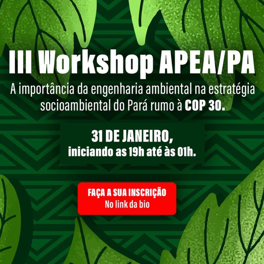 Nesta próxima sexta-feira (31 de janeiro) no salão de eventos do Clube de Engenharia do Pará (CEP) será realizado pela Associação Paraense de Engenharia Ambiental e Sanitária (APEA-PA) o III WORKSHOP APEA 2025, a partir das 19h, com a presença de especialistas das áreas de: Licenciamento Ambiental, Sustentabilidade e a Mudanças Climáticas, após a rodada de conversa será realizado um coquetel e música ao vivo com a banda Irreverência no Baile.