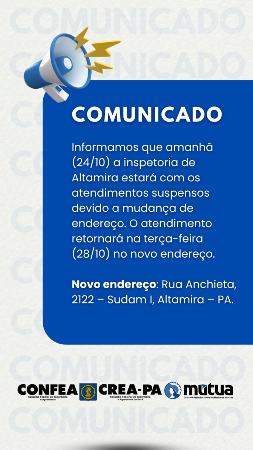 Com um espaço mais moderno e acessível, a nova inspetoria do CREA-PA em Altamira está localizada na Rua Anchieta, 2122 – Sudam I. O novo espaço faz parte de um conjunto de iniciativas voltadas à valorização profissional e à melhoria da estrutura de atendimento do Conselho.