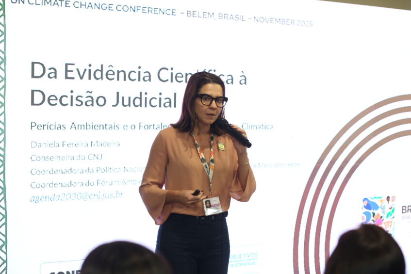 No dia 13/11 (quinta-feira) a Dra. Daniela Madeira do Conselho Nacional de Justiça (CNJ), foi painelista no Painel “Profissionais do Sistema e o conhecimento climático global – integrando ciência, técnica e políticas públicas” que contou com a presença da Professora e Dra. Luciana Prado, Dr. Lucio Sousa e da Engª. Ambiental e de Seg. do Trabalho, Eduarda Macedo. Foi uma oportunidade única para abordar a interseção entre Engenharia e Direito em um tema de tamanha relevância global.